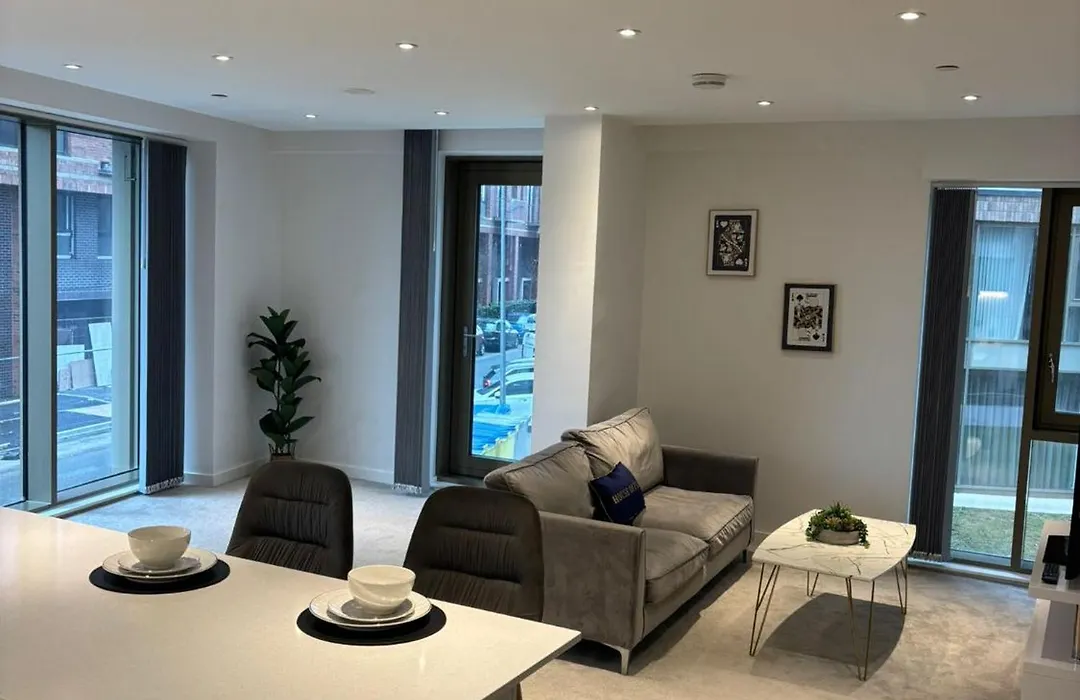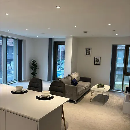 Gelegen binnen een autorit van 10 minuten van Cricketstadion Old Trafford, Entire Modern Apartment In Manchester City Centre van 1000 m² bevat een balkon en een zitruimte met uitzicht op de tuin.